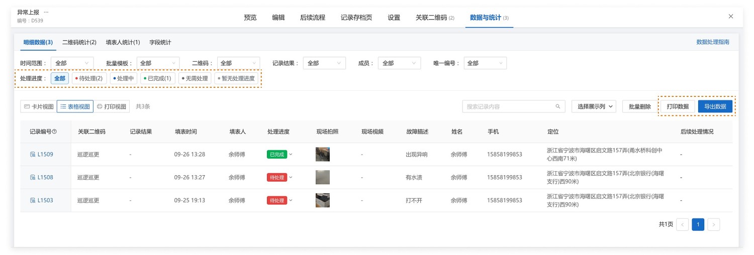 - 筛选查看:对于异常上报的明细数据,可以根据处理进度进行筛选,快速了解哪些巡逻点还未完成异常整改。
