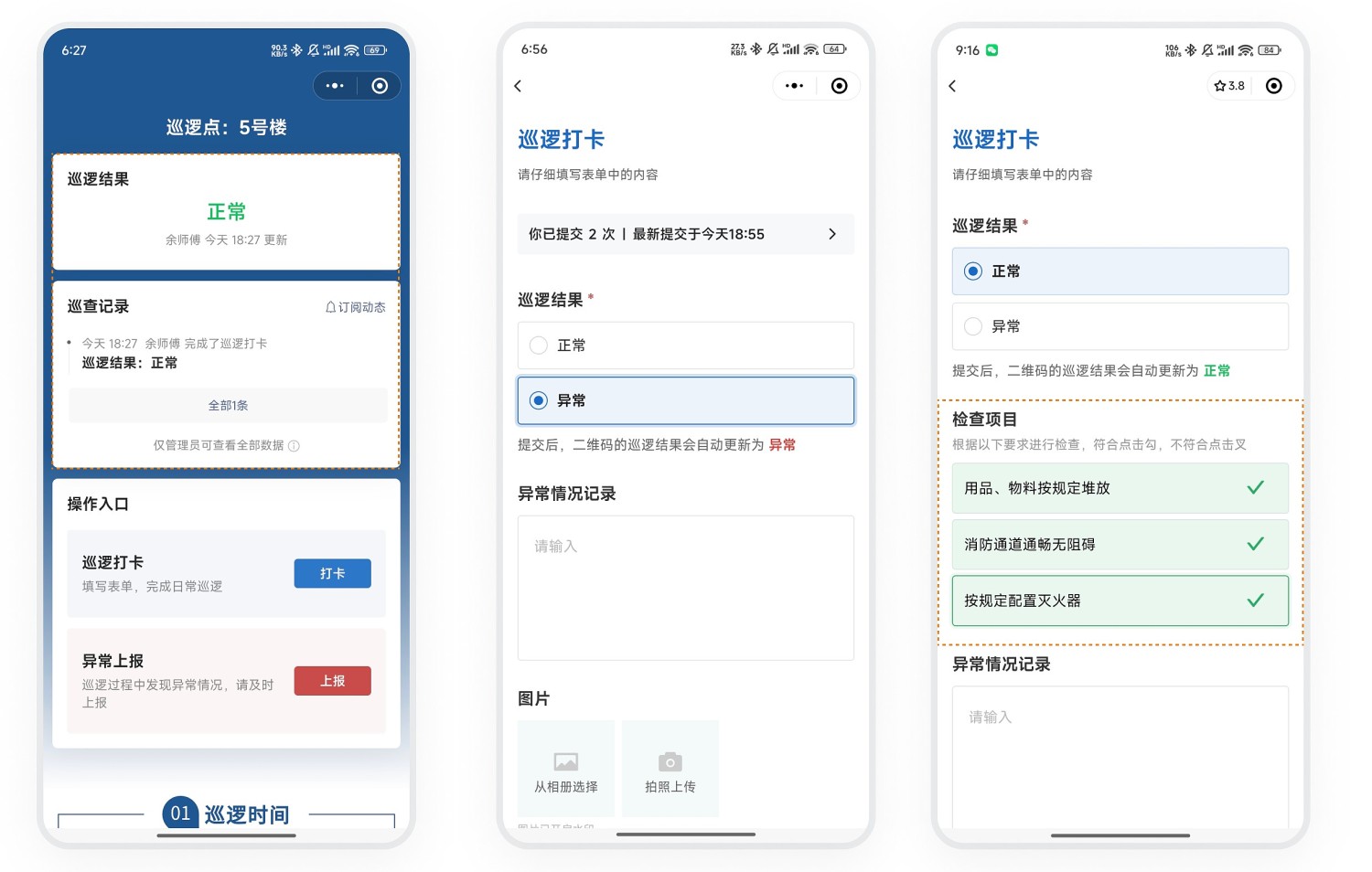 - 状态展示:二维码上的状态面板显示当前巡逻点的巡查结果:正常或异常。