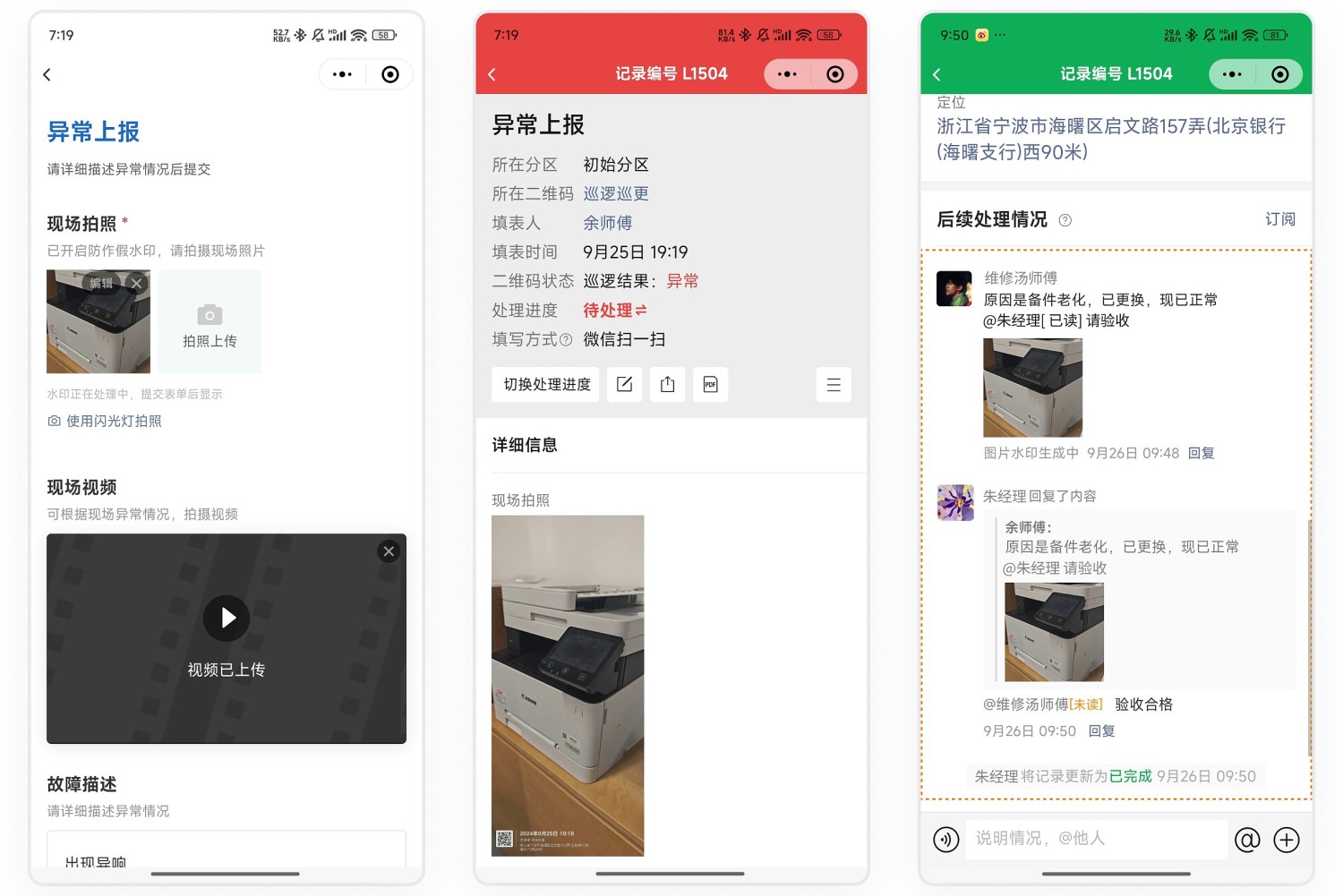 - 巡逻人员发现异常,使用微信扫码填写异常上报表单,详细描述问题并上传相关照片。