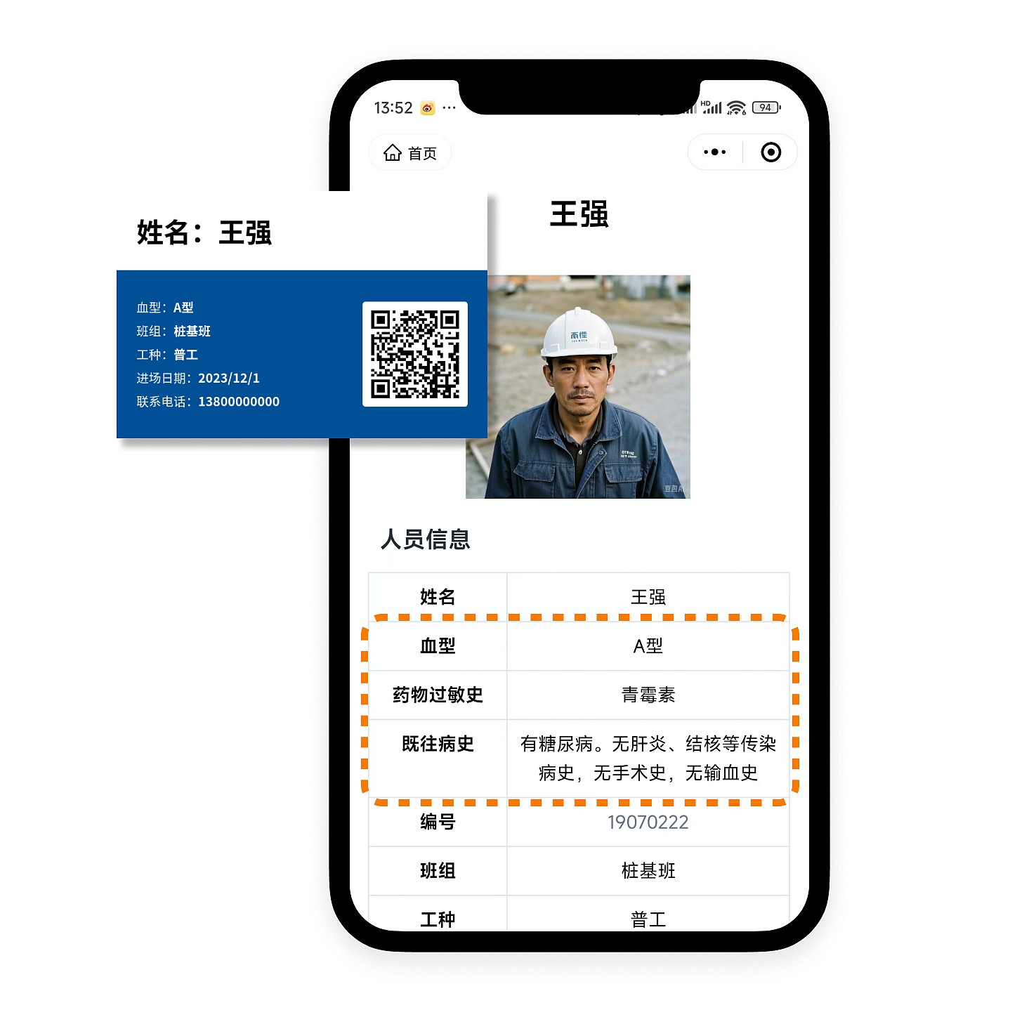 为每位工人制作包含照片、身份信息、安全培训等资料的二维码,贴在安全帽、反光背心或工牌上。现场检查时,微信扫码即可获取人员信息,实现“一人一帽一码一档”,看码识人,扫码查档。